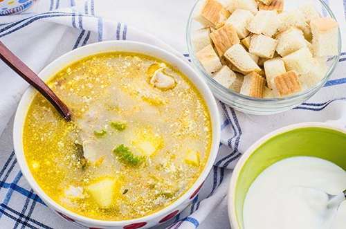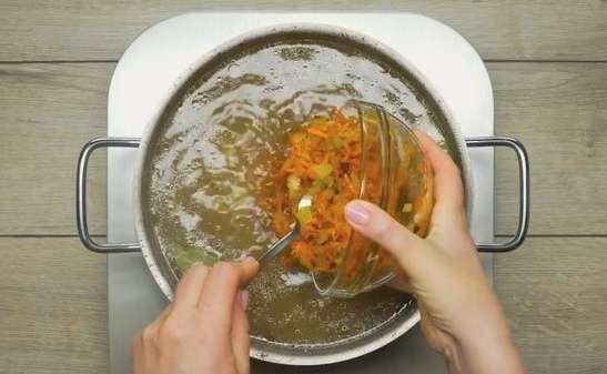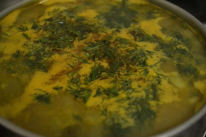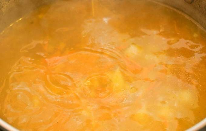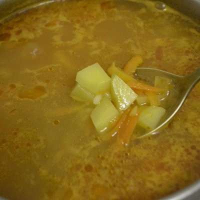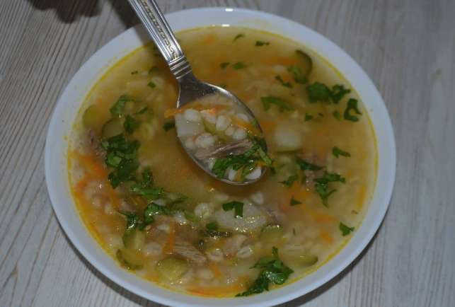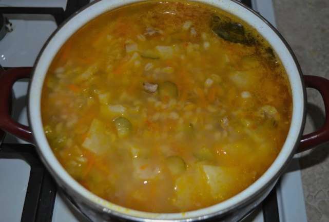 - We brengen groenten over naar een pan. Schenk hier parelgort en kruiden. Kippenvlees kan van het bot worden verwijderd. Kook de soep 25-30 minuten tot de aardappelen en granen gaar zijn.