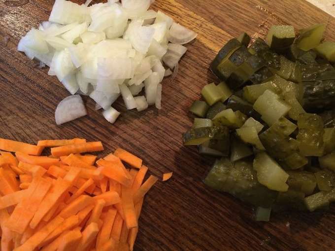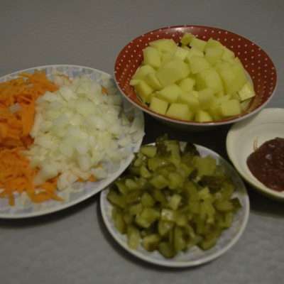- Laten we ook de rest van de ingrediënten klaarmaken. Snijd de aardappelen, uien en komkommers in kleine blokjes. Wrijf de wortelen op een grove rasp.