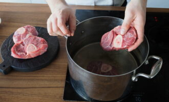 We wassen het kalfsvlees, snijden het indien nodig in kleinere stukken, vullen het met water en steken het in brand. Voeg ook zout, gepelde ui en laurierblaadjes toe aan de pan. Kook ongeveer 1 uur.