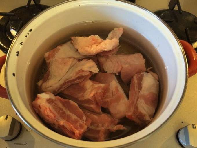 - Doe de varkensribbetjes in een pan, bestrooi ze met zout en vul ze met water. Kook op laag vuur gedurende 30-40 minuten.