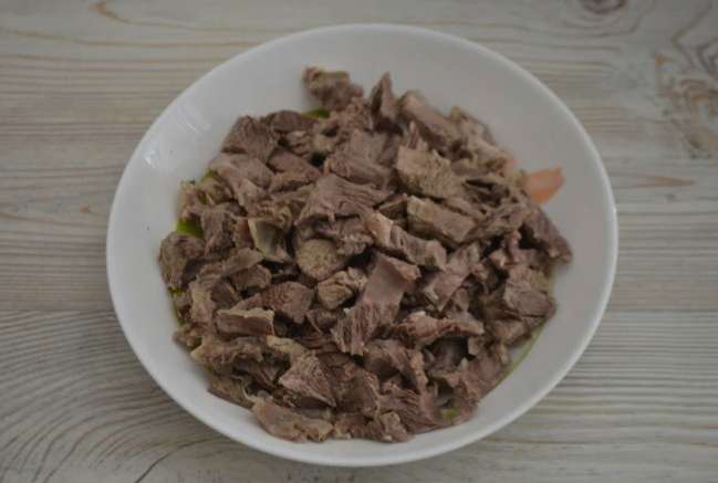 - Een uur later halen we het vlees uit de bouillon. Laat afkoelen en snijd in kleine stukjes. Doe het terug in de pot.