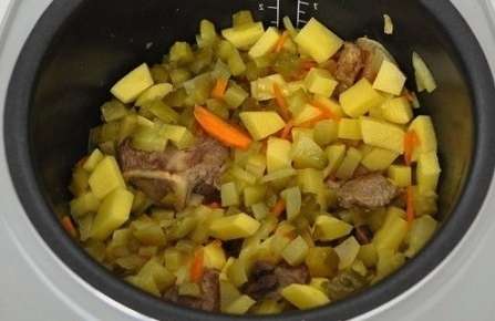 We halen aardappelen uit de pan en sturen er wortels en augurken in. Kook op laag vuur ongeveer 5 minuten.