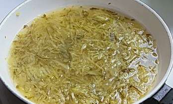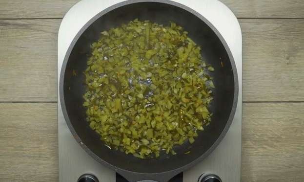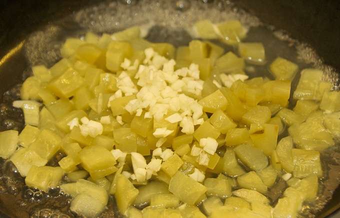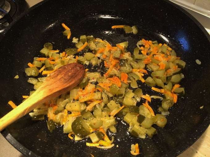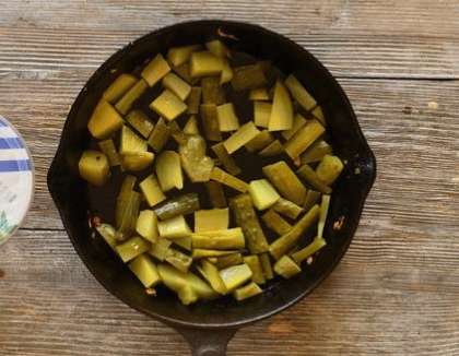 - Snijd ingelegde komkommers in kleine stukjes en laat ze een beetje sudderen in een koekenpan.