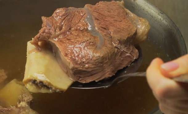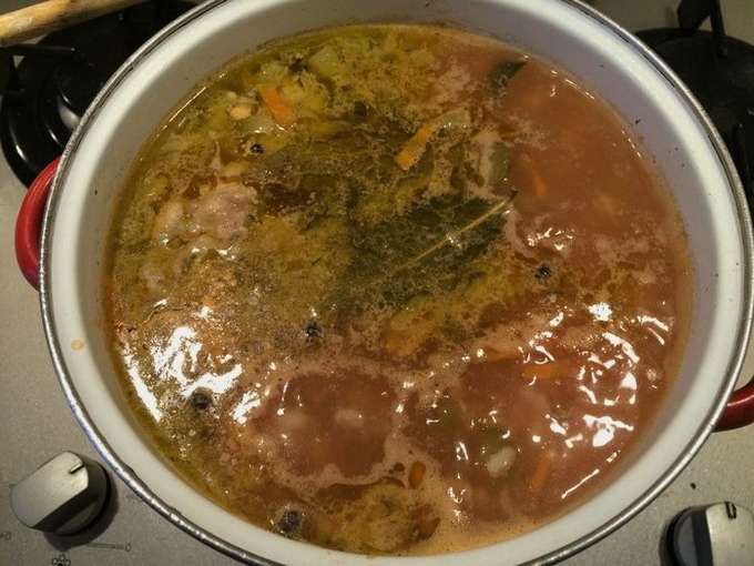- Kook het vlees in gezouten water met kruiden. Nadat u klaar bent, scheidt u het vruchtvlees van het bot en brengt u het terug in de bouillon.