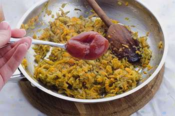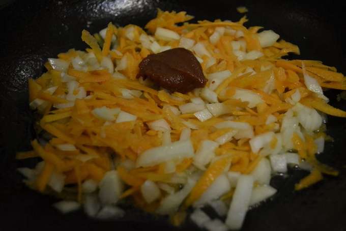 - We verhitten een koekenpan met plantaardige olie, waarin we de uien bakken en met wortelen en tomatenpuree.