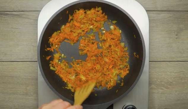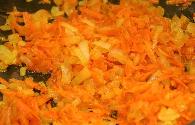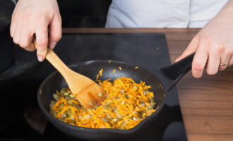 - Snipper de ui en rasp de wortel. Bak groenten 3-4 minuten in plantaardige olie.