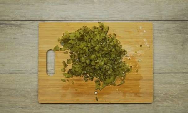 - Snijd de ingelegde komkommers in kleine blokjes. Verwijder zaden indien nodig.