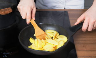 - Verwarm een koekenpan voor met plantaardige olie. Daarna bakken we de bereide groenten erin, zout ze naar wens.