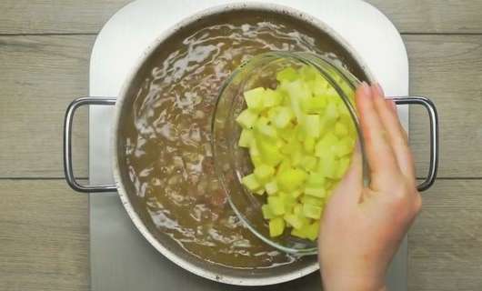 - We maken de aardappelen schoon, snijden ze in kleine stukjes en sturen ze naar de bouillon. We houden de soep op het fornuis totdat de groente gaar is.