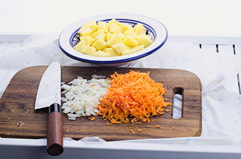 - Snijd de aardappelen in kleine blokjes. Snipper de ui en haal de wortel door een rasp.