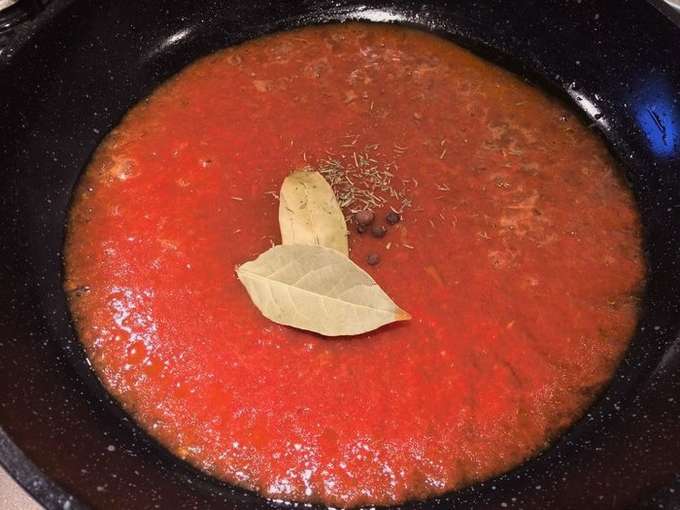 - Verwarm de tomatenpuree apart met kruiden en laurierblaadjes. Het is voldoende om het product ongeveer 3 minuten op matig vuur te houden.