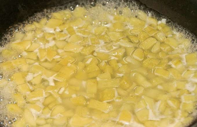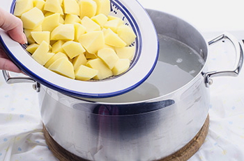 - Doe de aardappelen in een pan. Kook het ongeveer 15 minuten tot het half gaar is.