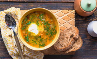 - Schenk de kant-en-klare soep in borden, voeg gehakte kruiden toe en serveer op tafel. Klaar!