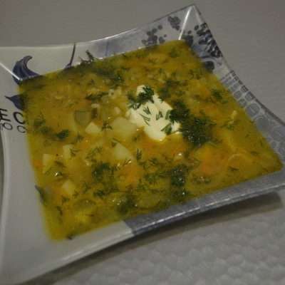 - Giet de geurige augurk in kippenbouillon in borden. We vullen het gerecht aan naar smaak en serveren. Klaar!