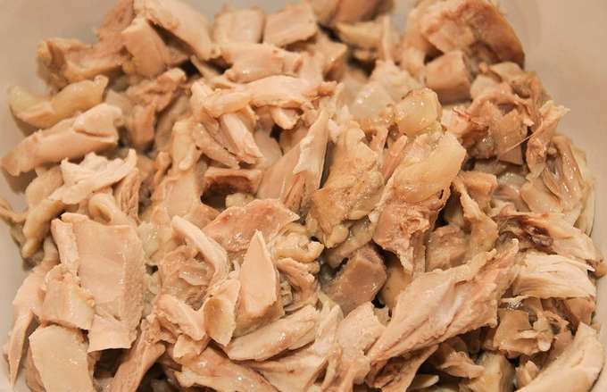 - Snijd de afgekoelde kip in kleine stukjes. We sturen het vlees terug naar de bouillon.