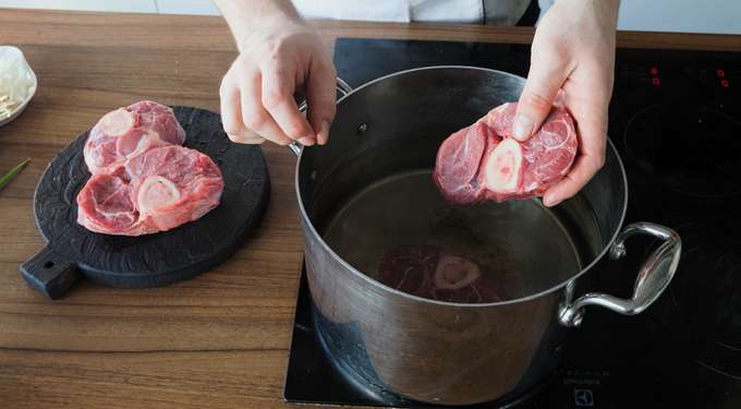 - Vul het vlees met water. Voeg zout toe en zet de pan 1 uur op het vuur.