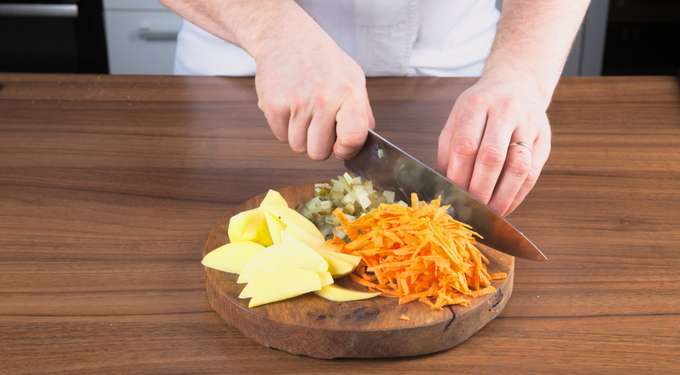 - Laten we ook de rest van de ingrediënten klaarmaken. Snijd de aardappelen, uien en komkommers in kleine blokjes. Wrijf de wortelen op een grove rasp.