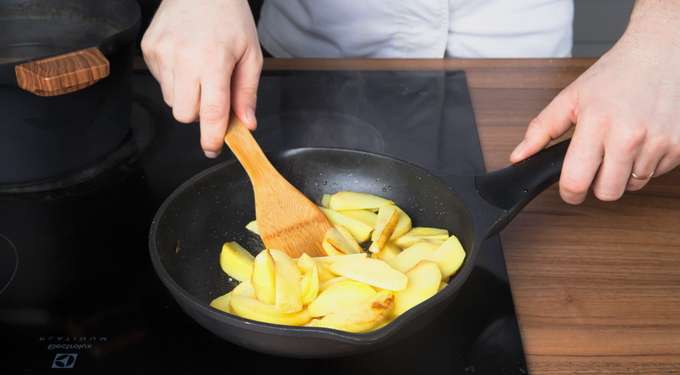 Verwarm een koekenpan voor met plantaardige olie en bak de aardappelen hierin gedurende 10-15 minuten.
