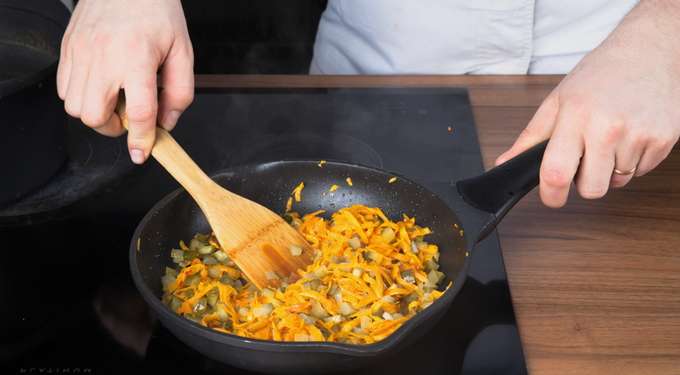 - Verwarm de pan met groente en boter. Bak hier 3-5 minuten geraspte wortelen en gesnipperde uien.