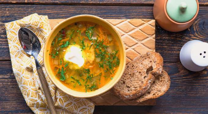- Schenk de kant-en-klare soep in borden, voeg gehakte kruiden toe en serveer op tafel. Klaar!