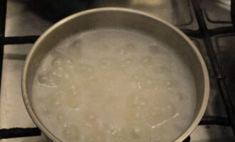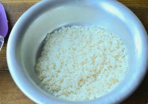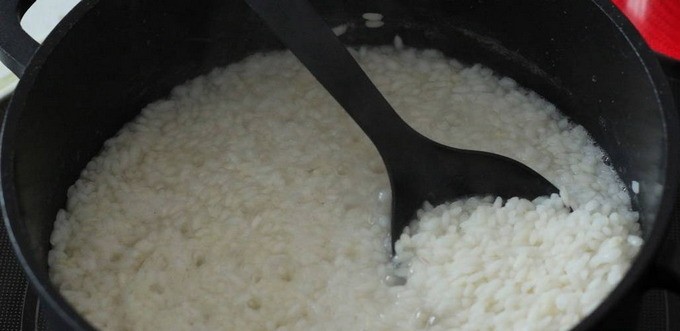 Rijst wordt grondig gewassen in verschillende wateren totdat de korrels doorschijnend worden. We plaatsen het gewassen graan in een pan, vullen het met twee glazen water en zetten het op het fornuis. Wacht tot het kookt, voeg wat zout toe, meng en kook tot het gaar is. De geschatte kooktijd is twintig minuten.
