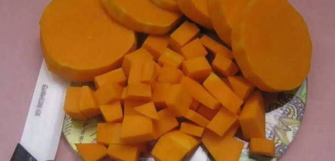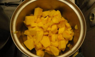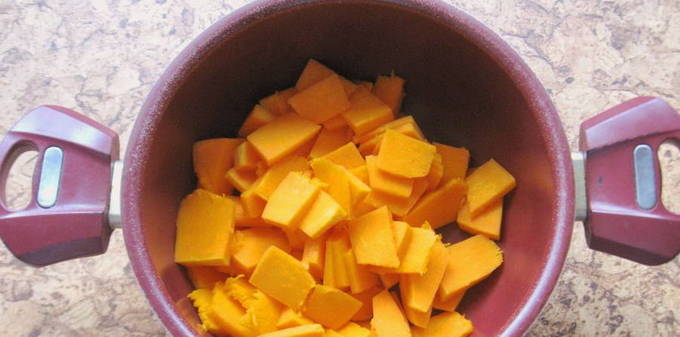 - We bevrijden de pompoen van de schil en zaden, snijden het vruchtvlees in kleine stukjes. Doe in een dikwandige pan.