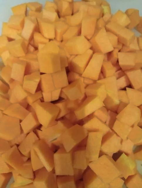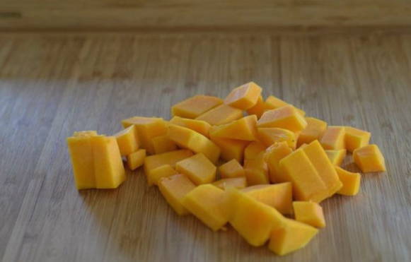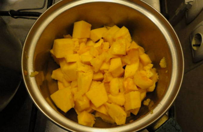 - Snijd de schil van de pompoen, verwijder de zaadjes. Snijd de geschilde pulp in kleine stukjes.
