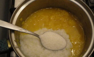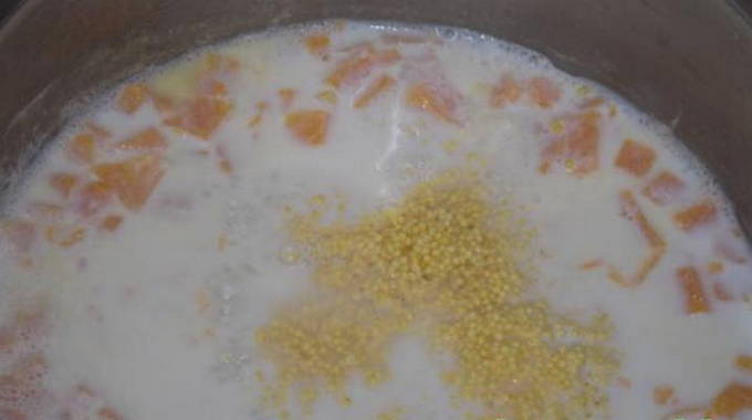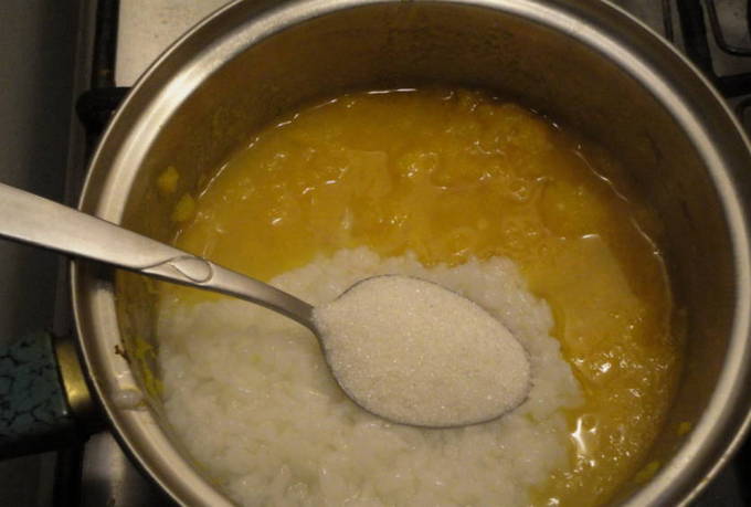 - Spoel de geweekte rijst opnieuw met gierst en dompel in melk met pompoen. Voeg zout en suiker toe, meng. We koken alles samen acht tot tien minuten.