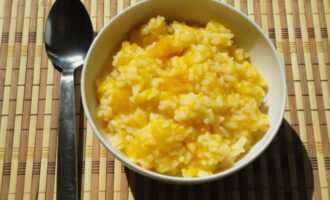 We verspreiden de pompoenmassa op de kant-en-klare rijst, doen suiker of honing, roeren, dekken af met een deksel, wikkelen in iets warms en laten vijf minuten staan om de smaken te combineren.