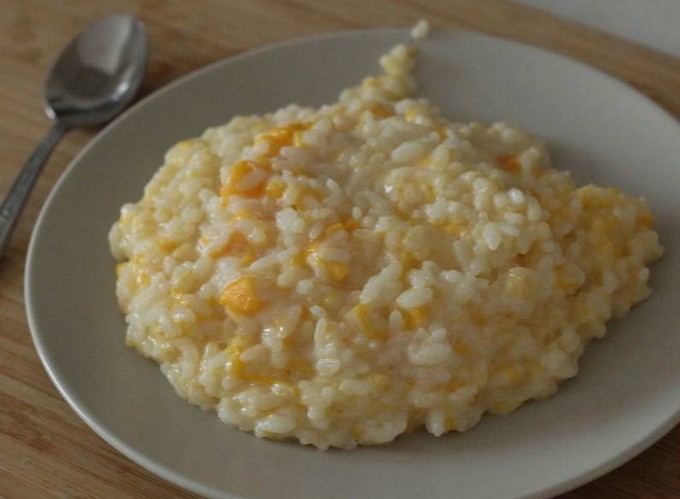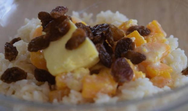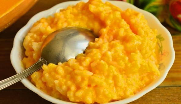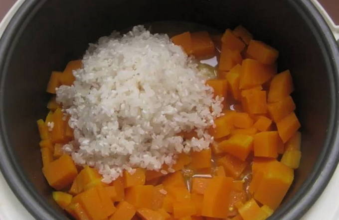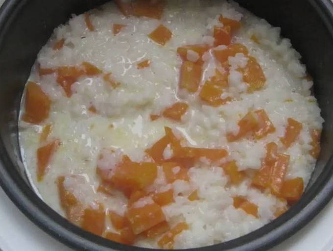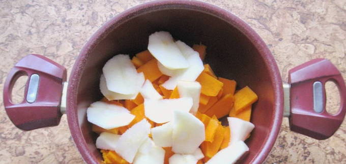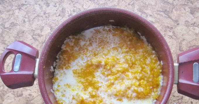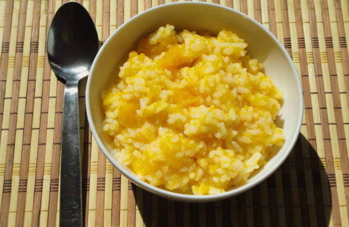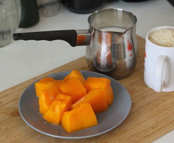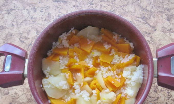 - We wassen de rijst in water. Giet de ontbijtgranen in een pan bij de pompoen en appels. We gieten water in, zetten het op het fornuis. Breng aan de kook en kook tot de rijst en pompoen zacht zijn. Vergeet niet te roeren.