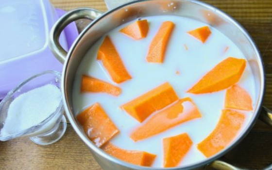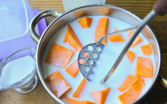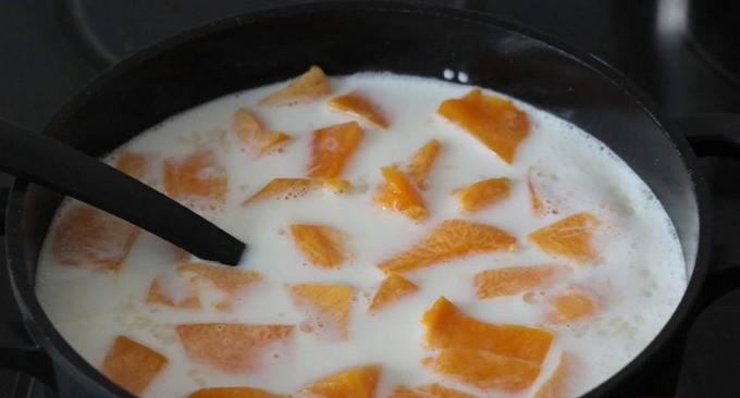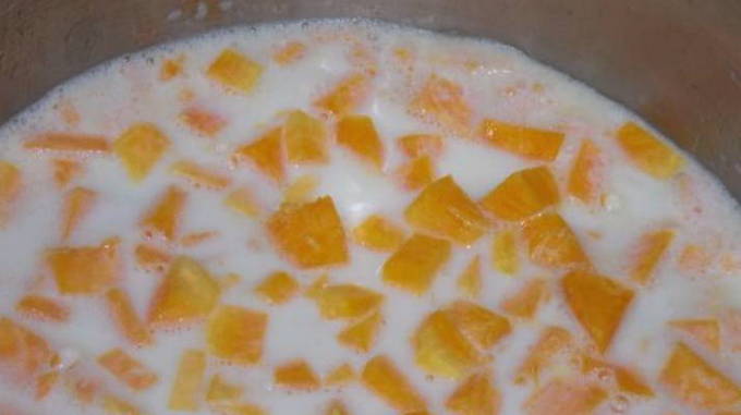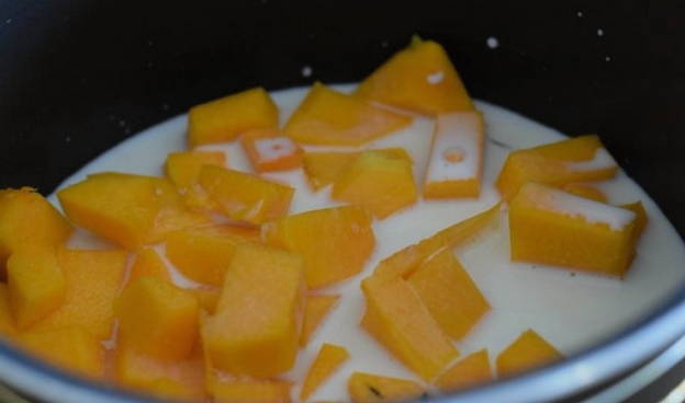 - Giet melk in een pan, breng aan de kook en laat de gehakte pompoen zakken. We koken vijf tot zes minuten.