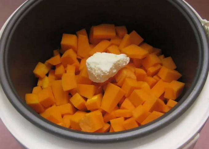 - Plaats de pompoen in de multikoker-kom, voeg zout en boter toe. We hebben de modus "Bakken" ingesteld op vijfentwintig minuten. De groentestukjes moeten goed zacht worden.