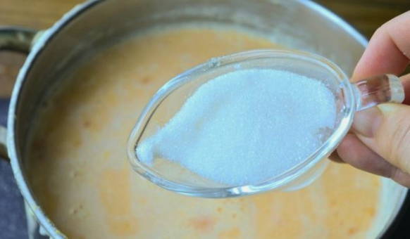 - Voeg zout en suiker toe aan de melk-pompoenmassa, meng.