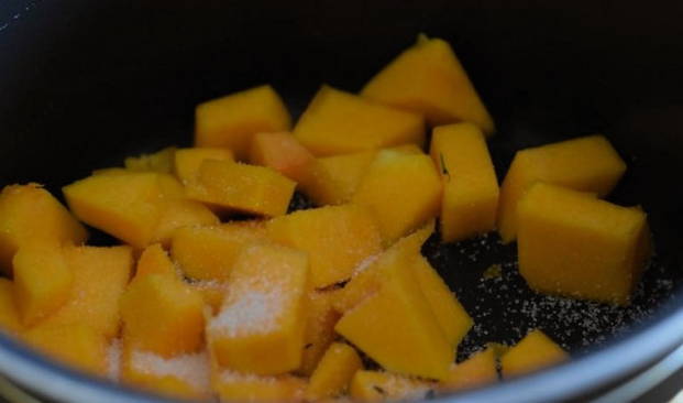 - Doe de pompoenstukjes in een pan, bestrooi met de resterende suiker.