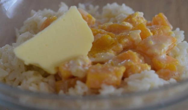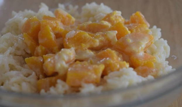 - Meng nu de in melk gekookte pompoen en de gekookte rijst.
