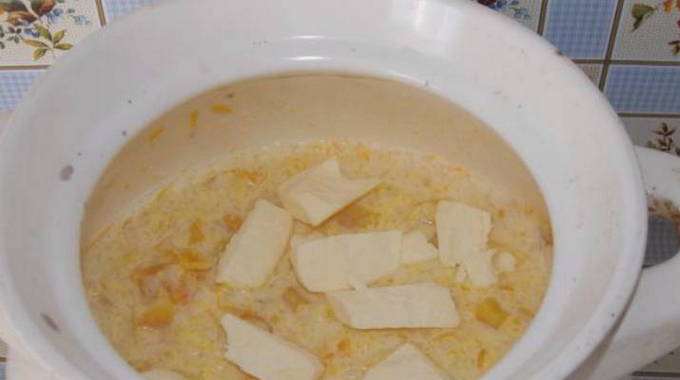 - Doe de halffabrikaten in een pan, doe er boter op en sluit af met een deksel. We plaatsen de pan met pap in de oven, voorverwarmd tot 220 graden. Dertig minuten koken.