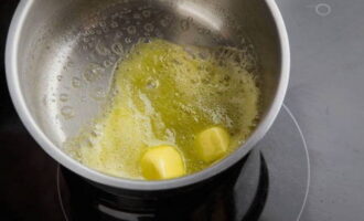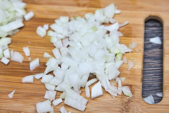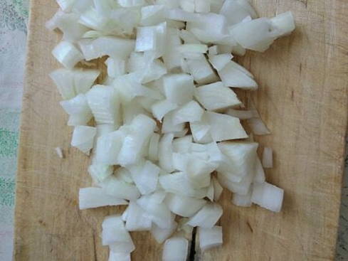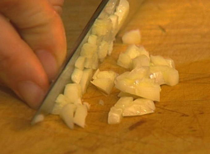 - Snijd de ui in hele kleine blokjes, meng met geperste knoflook en bak alles samen in zachte boter.