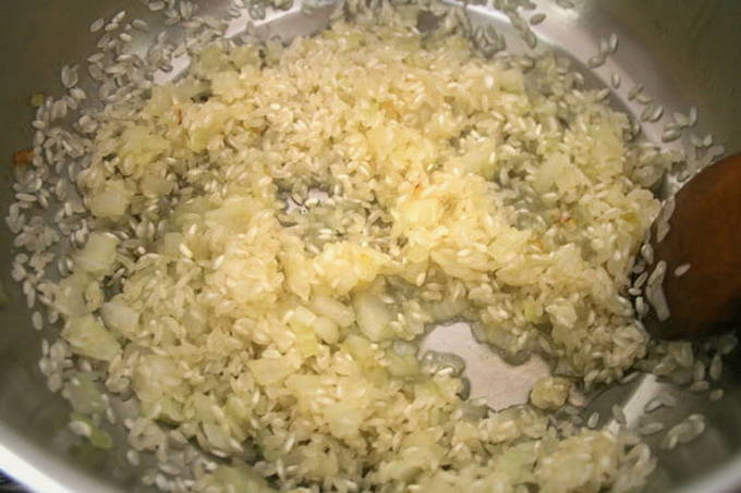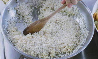Giet rijst in een pan en blijf onder voortdurend roeren een of twee minuten op laag vuur staan, zodat de korrels verzadigd zijn met aromatische olie.