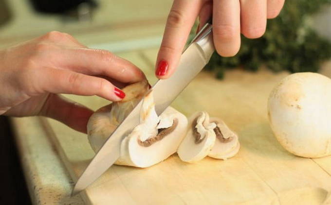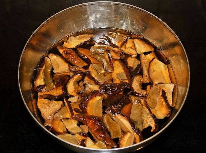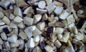 - Week droge champignons een uur in warm water, verse - schil. Snijd de voorbereide champignons in kleine blokjes.