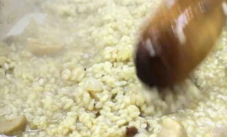Snijd de champignons in kleine blokjes, voeg toe aan de grutten. Bak 2-4 minuten en giet dan de inhoud van de pan met witte wijn. Het is belangrijk om de rijst constant te roeren zodat deze niet aanbrandt.