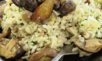 - Verdun rijst met champignons in kleine porties bouillon, roer er geleidelijk in zodat de vorige portie tijd heeft om te verdampen. Als de rijst gaar en gesmolten is, zout je de risotto en voeg je het kruidenmengsel toe.