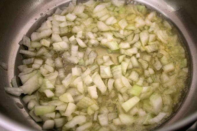 - Snipper de ui en bak met de toevoeging van olie in een diepe koekenpan of steelpan.