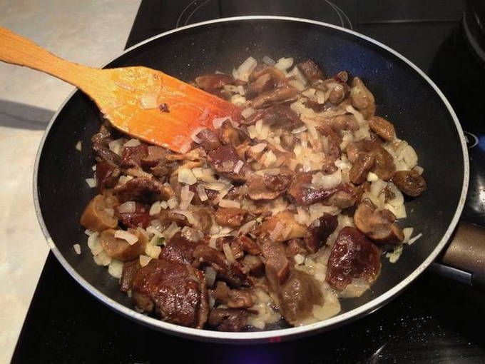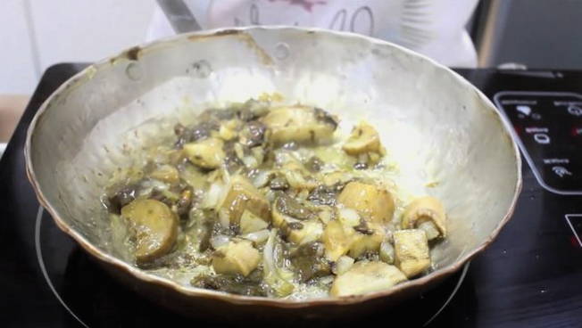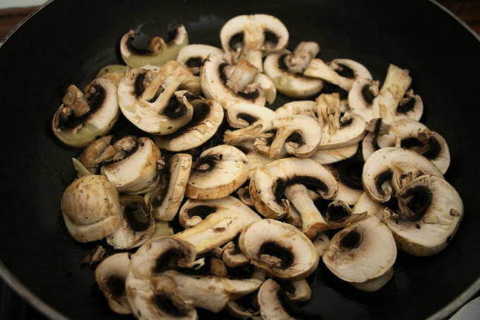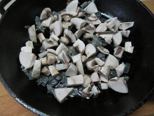 - Champignons moeten in kleine stukjes worden gesneden en op de ui met knoflook worden gedaan, zodat alles ongeveer 5-7 minuten samen gaar is.