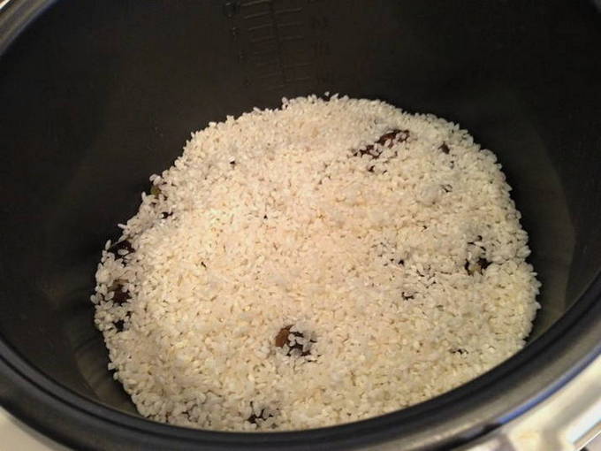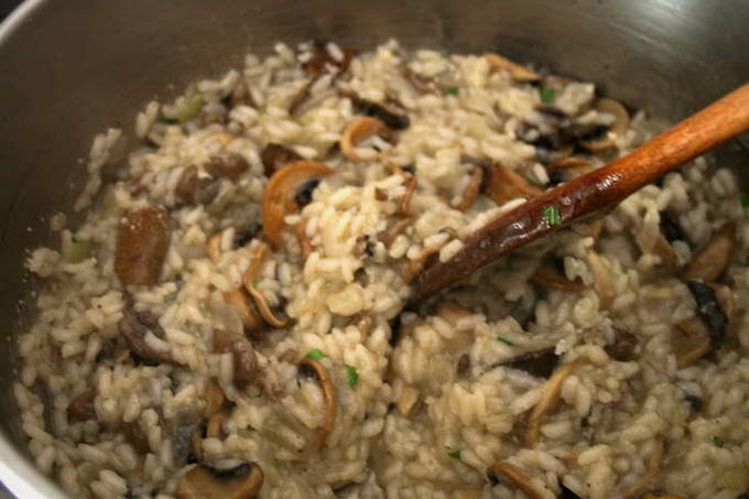 - Rijstarborio of een andere rondkorrel, spoel af en giet bij het uien-paddenstoelenmengsel.