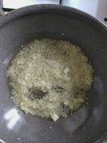 - Meng in een andere frituurpan de verwarmde olie met de rijst en bak deze lichtjes tot deze transparant wordt en giet dan in kleine porties de groentebouillon erbij, roer tot de vloeistof verdampt en voeg een nieuwe portie toe.