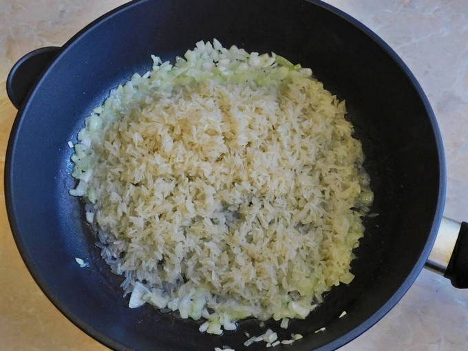 - Giet een kleine portie olijfolie in een aparte hittebestendige schaal, voeg daar rijst toe en verwarm het een paar minuten zodat het verzadigd is met verwarmd plantaardig vet, dan gieten we in kleine porties bouillon in het graan en voortdurend roeren. Zodra de bouillon is opgenomen, moet je het volgende deel erin gieten.