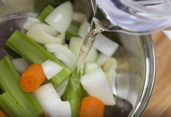 - Maak eerst een groentebouillon: kook in 1,5 liter water grof gesneden uien, selderij en wortelen. Laat ongeveer 20 minuten sudderen en zeef dan.