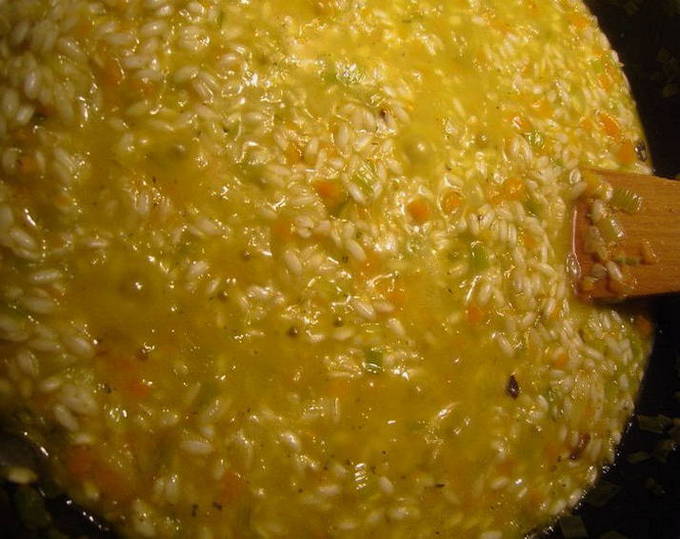 - Rijst moet voorzichtig worden overgebracht naar groenten en voeg portiegewijs de groentebouillon toe, roer tot de vloeistof is opgenomen, en voeg dan een nieuw deel van de bouillon toe.
