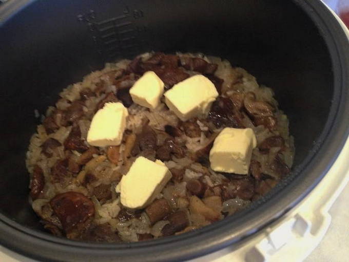 - Wanneer het apparaat piept, voeg dan de boter toe aan de rijst en ga door met koken in de "Verwarmen"-modus gedurende ongeveer 10 minuten.