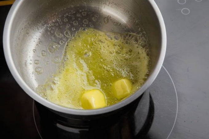 - Smelt de boter in een pan of diepe koekenpan en fruit hierin de fijngehakte knoflook en uien tot ze een aangename gouden tint krijgen.